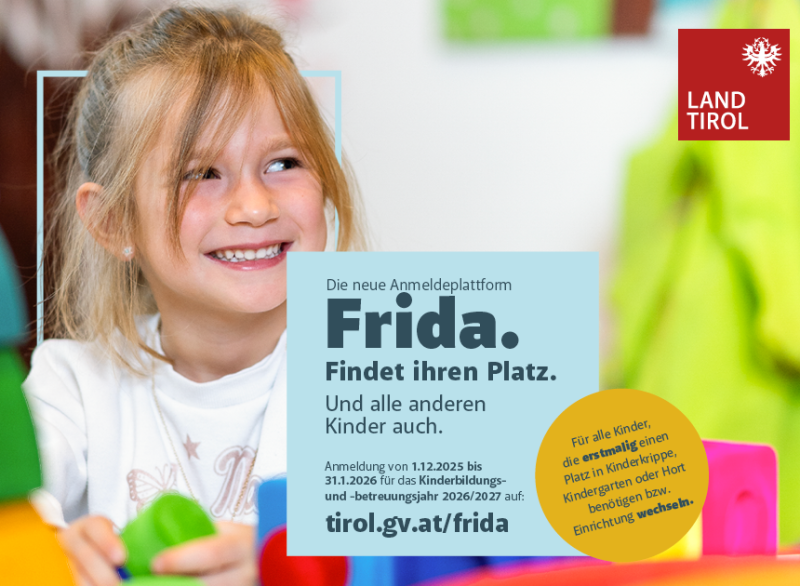wir möchten euch heute darüber informieren, dass für das Kinderbetreuungsjahr 2026/27 alle neuen Anmeldungen für den Kindergarten und die Kinderkrippe über die Internetplattform FRIDA des Landes Tirol erfolgen.